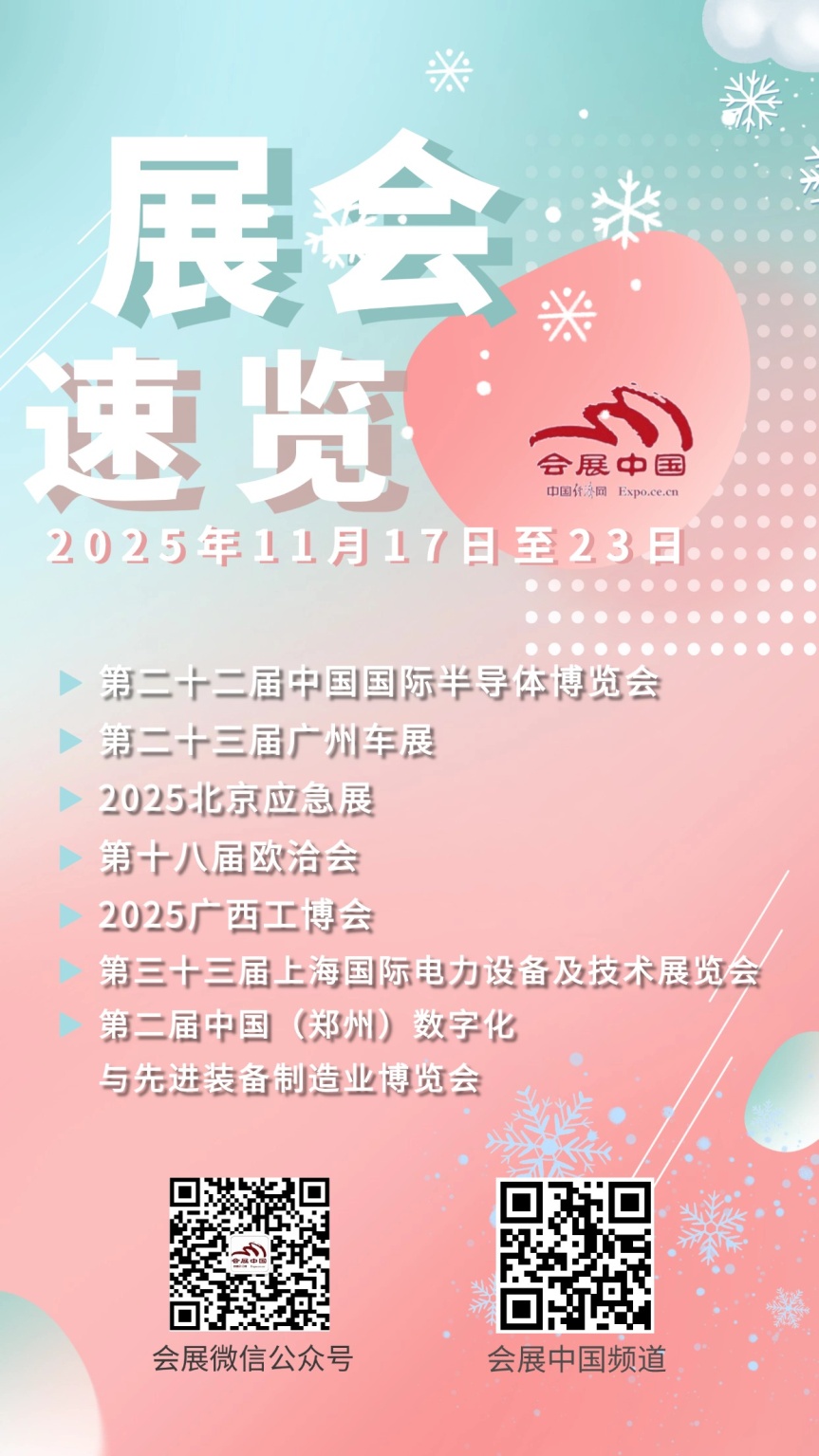 眼下已接近年末,全国会展业正迎来今年最后的高峰。 11月,多地各类大型展会大力举办,紧扣产业升级、国际合作,展现澎湃的经济活力。下周全国各地将举办哪些重要展会?中国经济网带您“期待”!一周展会概况 第22届中国国际半导体博览会 第23届广州车展 2025年北京应急展 第18届欧洲博览会 2025年广西工业博览会 第33届上海国际电力设备及技术快报 地点:国家会议中心 第22届中国国际半导体博览会(IC China 2025) 以“全景连锁展示、终端应用本届展会以“信息赋能、龙头企业驱动”为主线,重点展示集成电路全产业链,涵盖装备、材料、设计支撑等环节,横向对接生成人工智能、具身智能、量子信息等前沿领域。展会将设立协同服务展区、地方特色展团和产业融合展区,展示人才培养机制,开展现场招聘活动。同时举办主论坛、集成电路等高规格会议。举办企业家大会、平行论坛,探讨半导体技术应用和产业建设,吸引全球半导体企业和科研机构参与展示和交流 第23届中国广州国际汽车展 时间:11月21日至30日 地点:广州。展会地点 第23届广州国际汽车展览会(广州车展)是中国三大汽车展览会之一,被誉为中国汽车市场的风向标。本届展会以“新技术·新生活”为主题。预计将有来自全球1000多家展商参加展会,展览面积超过24万平方米,展示最新的汽车切割技术、产品和行业配套服务。 2025中国国际应急管理展览会 时间:11月18日至20日 地点:国家会议中心 2025中国国际应急管理展览会(北京应急展)以“科技促安全、智慧应急”为主题,聚焦救援应急管理、防灾救灾、消防、安全生产与事故四大领域。设立应急救援装备、城市安全装备专区展区展示先进预警预报系统、智能矿山技术装备等创新成果。第十八届中国-欧盟投资贸易和科技合作洽谈会 时间:11月19日至21日 地点:成都 第十八届中国-欧盟投资贸易和科技合作洽谈会(欧交会)以“互信、互通、共享、共赢”为主题,将就中欧双边合作安防、产业供应链等议题进行交流研讨。自2006年第二届在成都举办以来,经过近二十年的发展,已成为欧盟成员国参与最多、欧洲企业范围最广、中欧交流规模最大的投资、贸易和创新合作盛会之一。 2025中国-东盟(广西)国际工业博览会 时间:11月22日至24日 地点:南宁国际博览中心广西会展中心 2025年中国—东盟(广西)国际工业博览会(广西工博会)以“数智融合、链接东盟”为主题,规划展览面积超过2万平方米,吸引了来自全球20多个国家和地区的400多家企业参展。第33届上海国际电力装备及技术展览会 时间:11月18日至20日 地点:上海新国际博览中心 作为亚洲电力行业的盛会,第33届上海国际电力装备及技术展览会(EP Shanghai 2025)以“数字智能赋能新电力系统,绿色引领能源未来”为主题,规划展览面积86,000平方米,汇聚2,300余家展商与来自世界各地的80,000余名专业观众共同探索最新电力科技与未来碳双重目标下的再趋势。上海国际储能技术应用展览会同期举行。第二届中国(郑州)数字化与先进装备制造博览会 时间:11月21日至23日 地点:郑州国际会展中心 第二届中国(郑州)数字化与先进装备制造博览会以“高端、智能、绿色、融合”为主题。规划展览面积3.3万平方米,设有综合、数字、未来产业、先进装备等八个功能区和六大主题展区。